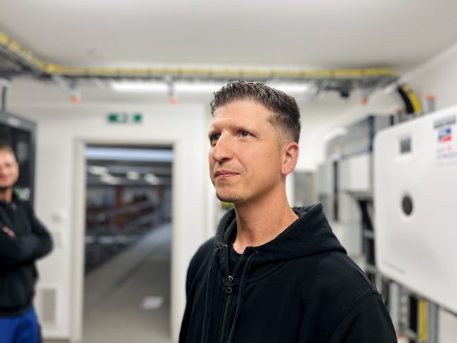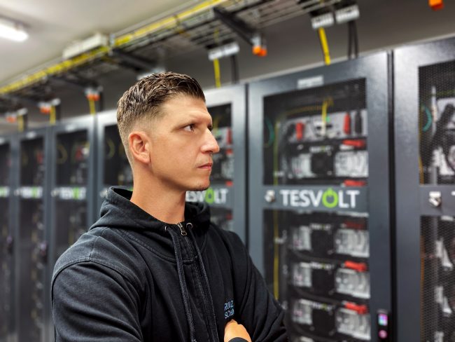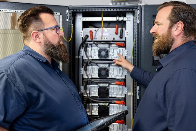 Die beiden Geschäftsführer von RUIZ + SCHNEIDER vor einem Tesvolt-Speicher: Marcus Schneider (links) und Christian Schneider.