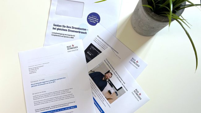 Das Mailing zum Thema Lastpitzenkappung von RUIZ + SCHNEIDER besteht u.a. aus Umschlag C4, Anschreiben, Beispielrechnung Lastspitze sowie einem Verweis auf das Video von Geschäftsführer Christian Schneider.