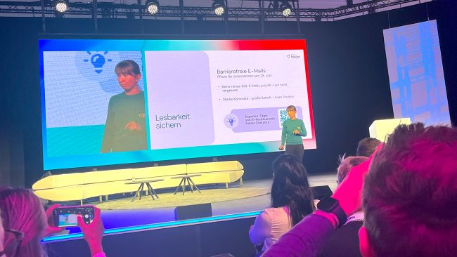 Katharina Kremming auf der Bühne hält ihren Vortrag über das E-Mailing in der Hochphase des Jahres: Black Friday bis Xmas.
